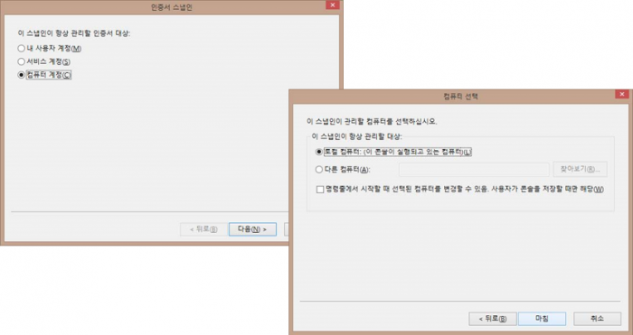 4. 인증서 스냅인 창에서 "컴퓨터 계정" 선택, 다음 화면에서 "로컬 컴퓨터" 선택![]()