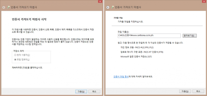 7. 인증서 가져오기 마법사에서 로컬컴퓨터 저장소 선택, 저장된 domain.pfx 파일 가져오기